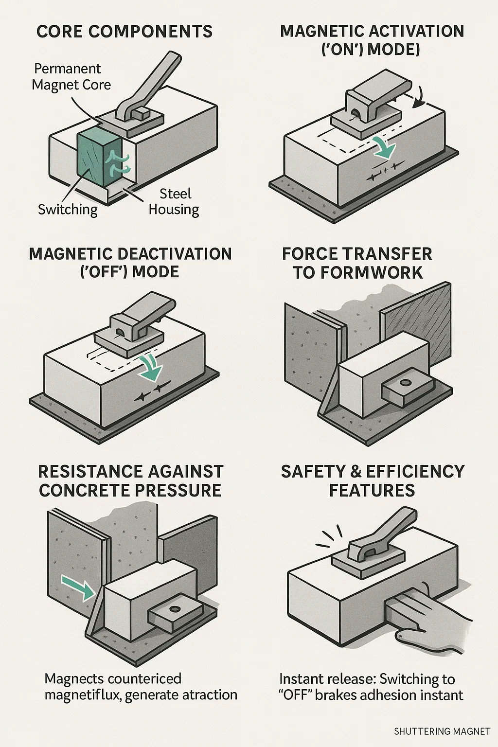 إغلاق المغناطيس تعمل من خلال القوة المغناطيسية التي تسيطر عليها لتأمين الصالات الخرسانية. فيما يلي تفصيل خطوة بخطوة لوظائفهم: