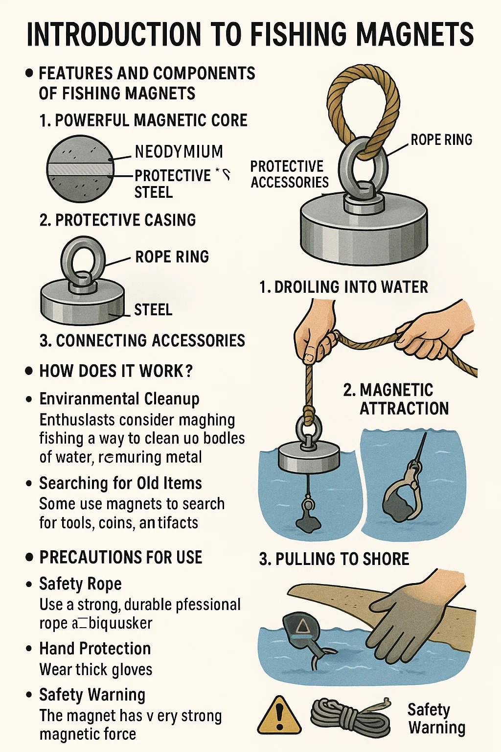 عندما يتلامس المغناطيس مع المعادن المغناطيسية (مثل الحديد أو الفولاذ أو النيكل) في قاع الماء، فإن المجال المغناطيسي القوي يجذبها ويلتصق بها على الفور.