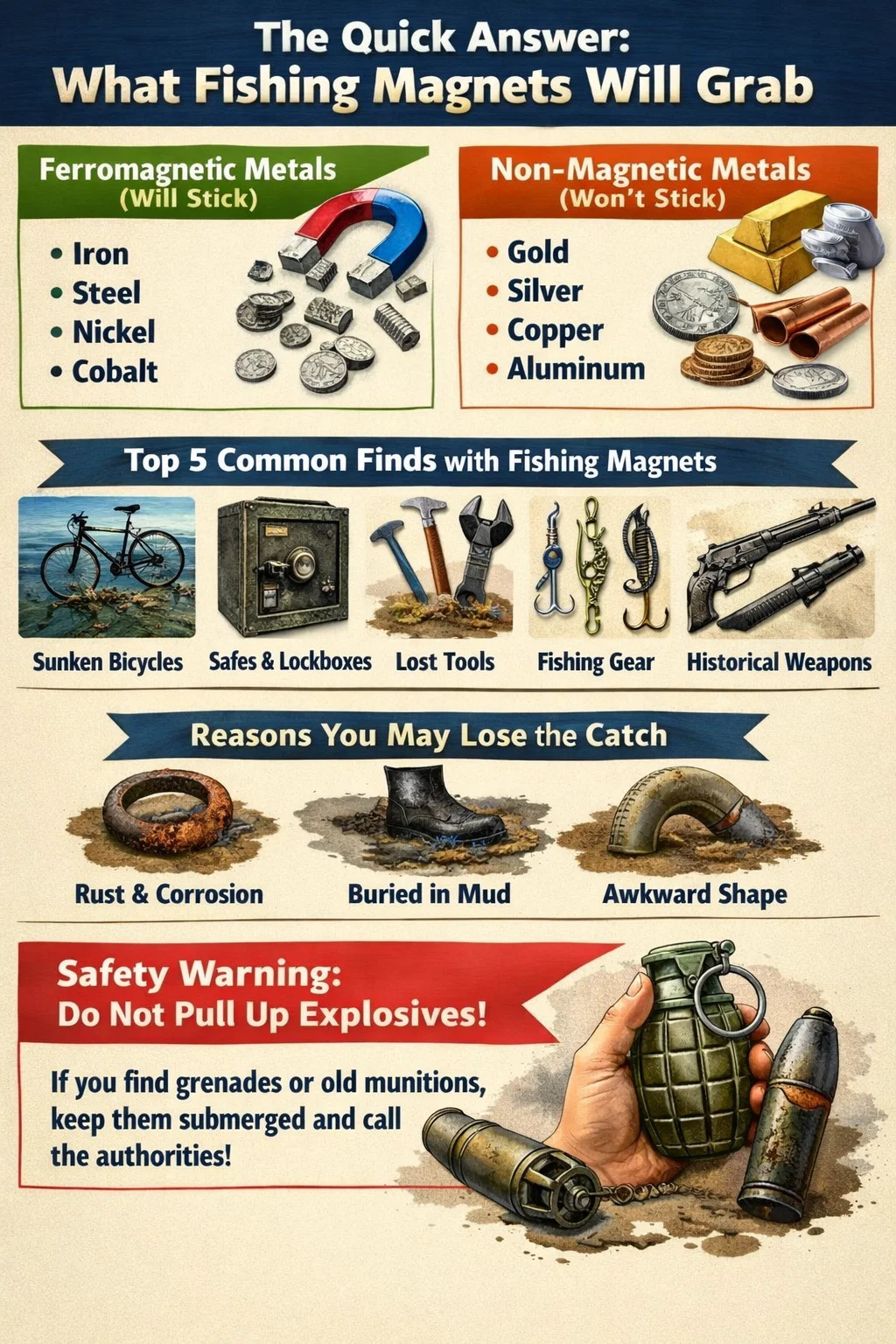 بينما مغناطيس الصيد هي أدوات للاكتشاف، ويمكنها أيضًا العثور على الخطر. في أجزاء كثيرة من أوروبا وبعض أجزاء الولايات المتحدة، يمكن سحب الذخائر غير المنفجرة مثل القنابل اليدوية أو قذائف الهاون القديمة. من الممكن أن تظل هذه العناصر نشطة وخطيرة للغاية. إذا رأيت شيئًا يشبه المتفجرات، لا تلمسه وأبقيه مغمورًا بالمياه إن أمكن، واتصل بفرقة القنابل على الفور.
